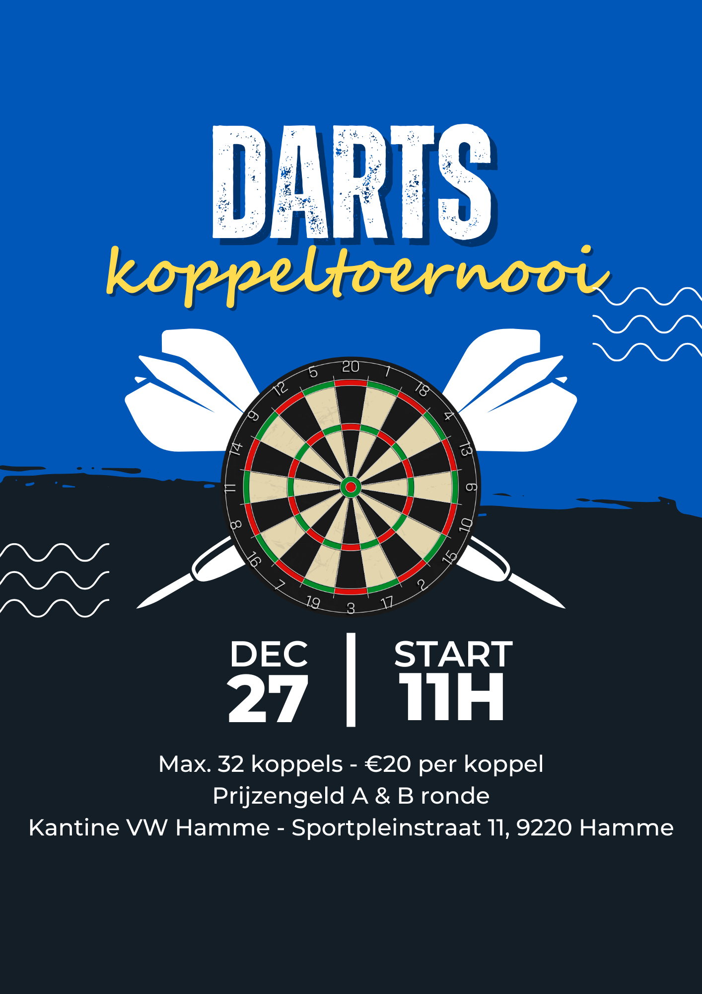 Koppeltoernooi VW Hamme 27 december 2025 - Start om 11H Max. 32 koppels - €20 per koppel Prijzengeld A & B ronde Kantine VW Hamme - Sportpleinstraat 11, 9220 Hamme